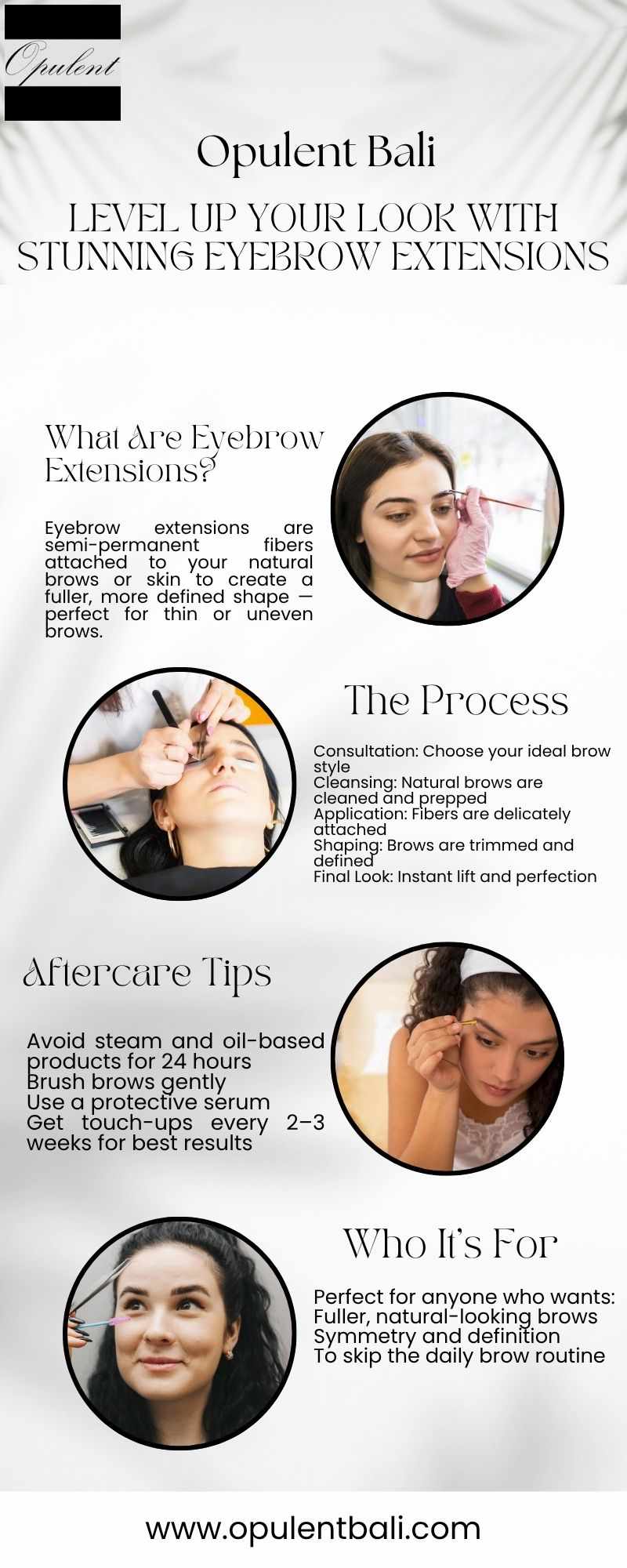 Brows frame the eyes and shape your look; that is why we do them with care at Opulent Bali. Our application of eyebrow extensions is designed to create a natural yet noticeable enhancement—the result: not heavy or artificial brow extensions, but strong brows that shape to your style. Be prepared to walk out with a new look and a smile on your face.